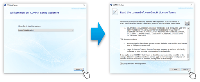 - Select installation path -> It is recommended not to change the default directory (Documents)! In this directory COMAN does not need administrator permissions and can also execute later updates